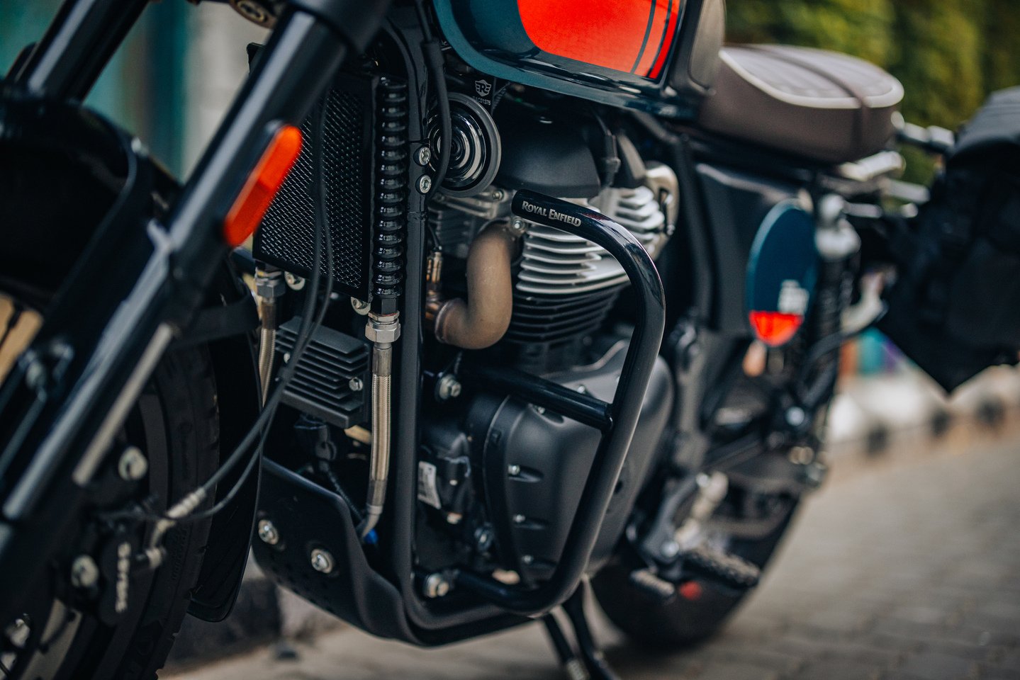 Get full protection without compromise. The large engine guards are designed for an optimum balance of protection and style. Made with 25mm stainless steel tubes, It comes with corrosion resistance and has a premium finished discrete laser etched Royal Enfield branding on the horizontal bars.