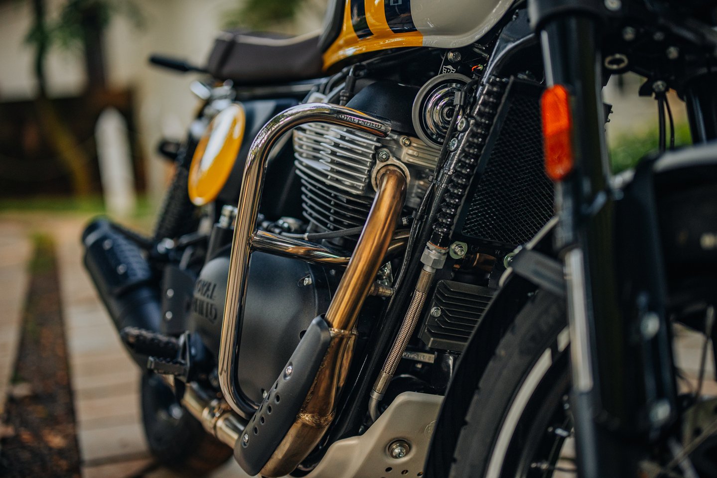 Get full protection without compromise. The large engine guards are designed for an optimum balance of protection and style. Made with 25mm stainless steel tubes, It comes with corrosion resistance and has a premium finished discrete laser etched Royal Enfield branding on the horizontal bars.