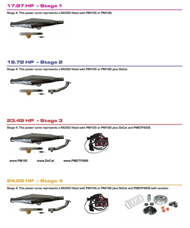Stage 4: PM105 or PM106 Slip on Exhaust + De-cat Pipe + PMDTFO009 Fuel Injection Module + M5120216 Variator Kit.