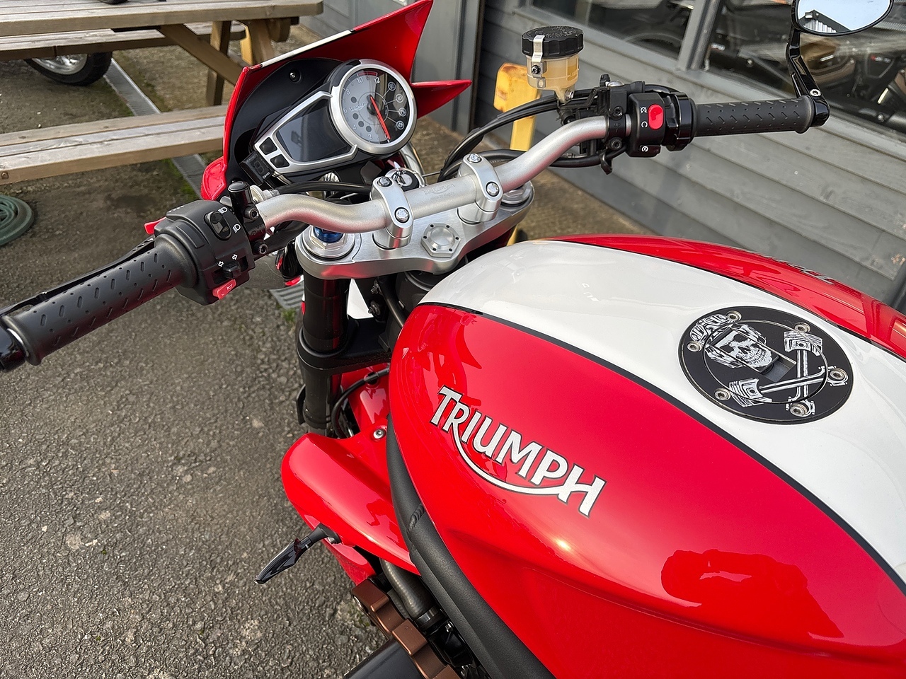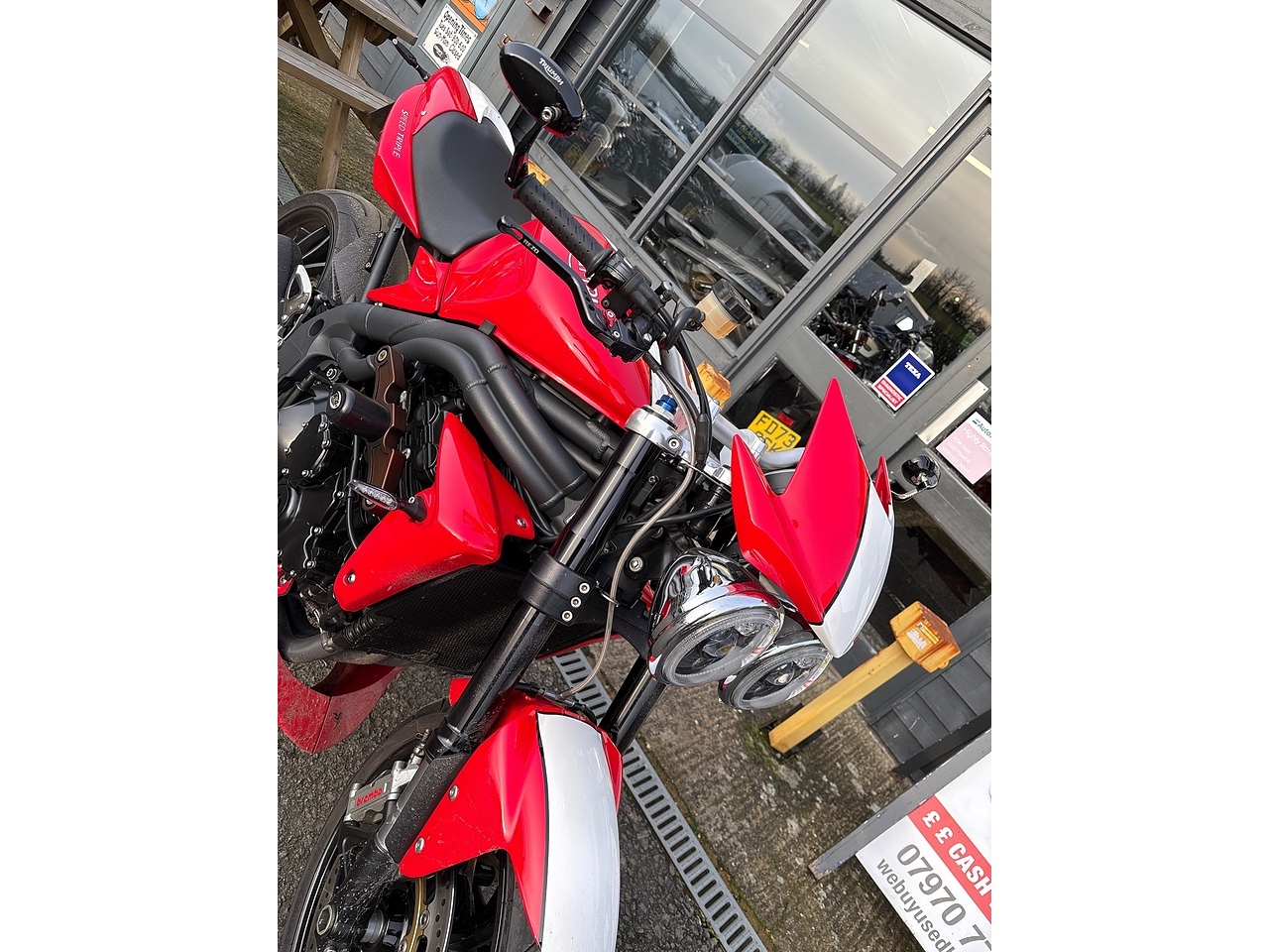 British Beef On Two Wheels! The stonking Triumph Speed Triple has the beautiful 3 cylinder motor that delivers sensational power and a lovely growl too! With a roomy upright riding position and handsome looks these are BRILLIANT BIKES! This stunning SE Model has the White Stripe Paint & has fitted Triumph Belly Pan, Headlamp Cowl, Seat Cowl, Bar End Mirrors, LED Indicators, Axle Plug & Hugger. Also R&G Engine Protection, Radiator Grille & Tail Tidy. Also Anodised Levers & a Beautiful HP Corse Exhaust that sounds AMAZING! Buy your next motorcycle from “The Home Of Serious Spannerin!” We are VERY fussy about the bikes we sell in our showroom! We vigorously check the bikes before choosing the very best examples, with good service history. Then, our time served, expert, mechanics carefully prepare them to the very highest standards. We only use the best parts & oils in our workshop. We check everything twice, perform a road test and then check again! The bike will only leave when we are happy that its right!